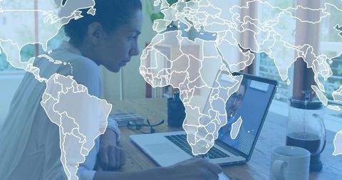 Remote teamwork at home office woman taking notes during video call with world map overlay