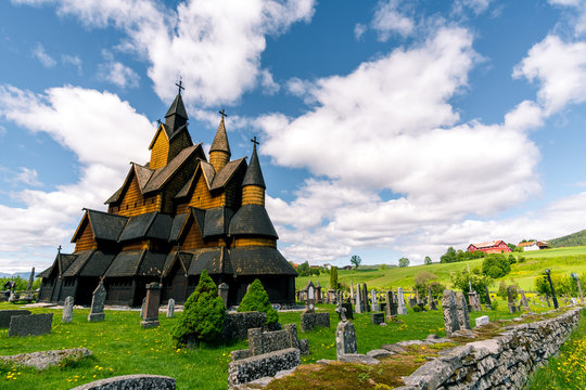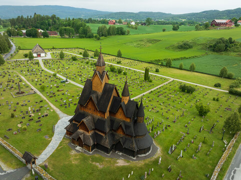 Heddal Stave Church in Telemark Norway. Norse Tradition Medieval Wooden Architecture Featuring Dark Timber Walls, Steep Tiered Roofs, and Intricate Carvings