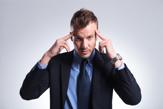 mind games telepathy thought transfer and brain power. beautiful girl concentrating on invisible object above her. index fingers on temples. young beautiful blond woman portrait on pink background.