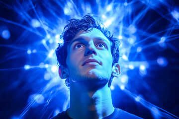 Portrait of an enlightened Caucasian male physiotherapist with glowing chakras. The telepath holds his fingers to the scales while reading your mind