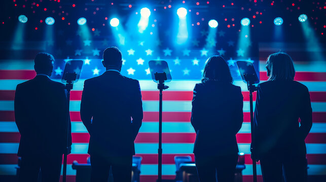 Presidential Candidates on Stage with American Flag. silhouette of four presidential candidates standing on stage with teleprompters in front of illuminated American flag backdrop,