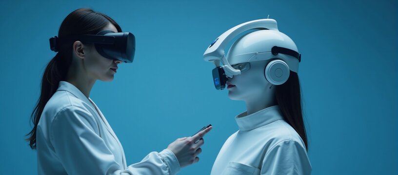 Healthcare professional utilizing VR technology to operate on patients from afar in a sterile blue-toned setting Modern Medical VR Gadget Isolated