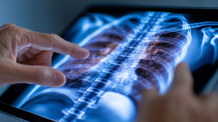Touchscreen Radiology Review – Gloved Fingers Zoom an X-Ray Spine Scan on Tablet, Demonstrating Digital Imaging Analysis and Telehealth Collaboration