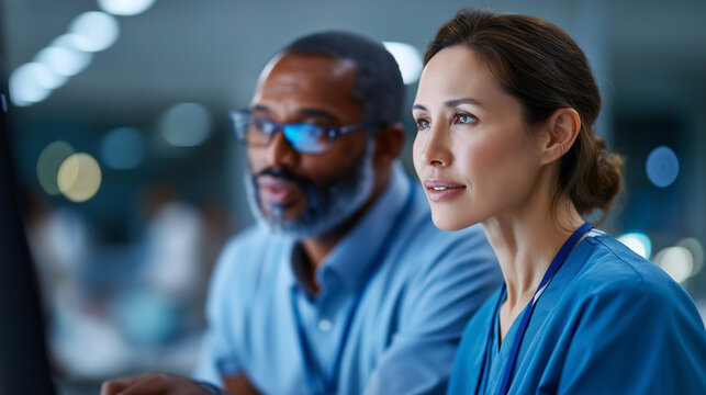 Two multiethnic radiologists analyzing imaging results monitor and cursor sharp faces softly defocused radiology analysis faceless background defocused PACS consult hospital