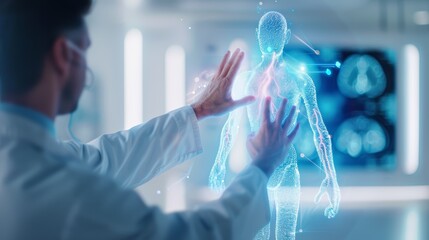 A doctor interacts with a holographic human body model, showcasing advancements in medical technology.