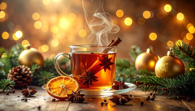 escena navideña hiperrealista y acogedora, centrada en una taza de té humeante con especias de invierno.