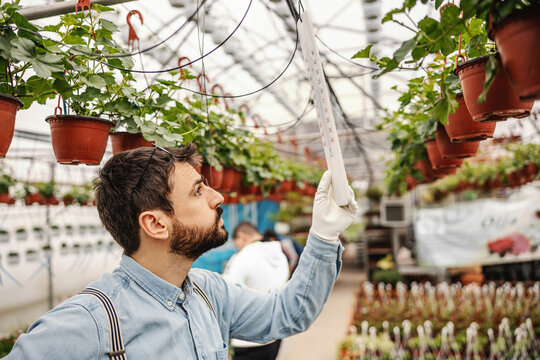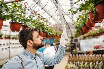 Focused skilled butcher shop worker checking raw meat in cold storage room, measuring temperature of dressed pork carcasses hanging on hook frame..