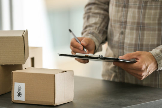 Courier making notes in delivery receipt at table