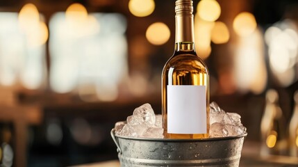 Iced wine bottle in a silver bucket surrounded by ice cubes with a blank label in a warm, ambient restaurant setting
