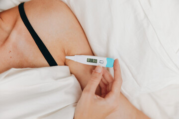 Woman in bed holding an electronic thermometer in one hand and another thermometer in the other hand