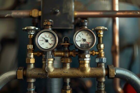 Closeup of dual pressure gauges attached to brass pipes, showcasing industrial equipment