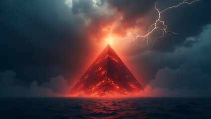 Dramatic depiction of a tempestuous ocean under a stormy sky, illuminated by lightning. Waves crash