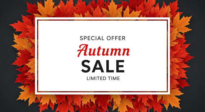 Autumn sale banner features red and orange maple leaves surrounding a white rectangle with "Autumn Sale" text, symbolizing seasonal discounts and promotions