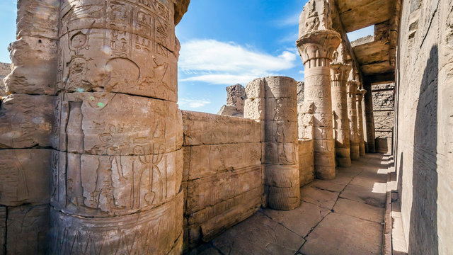 The ruins of a temple with columns on the territory of the Edfu complex, located on the west bank of the Nile, Edfu, Upper Egypt