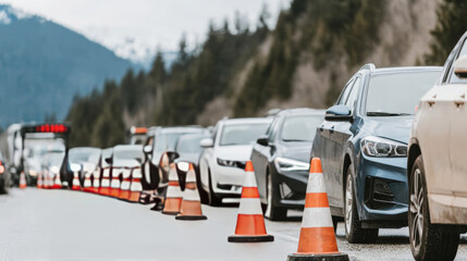 Traffic jam slowing automobiles on a mountain road with temporary signal and road construction cones