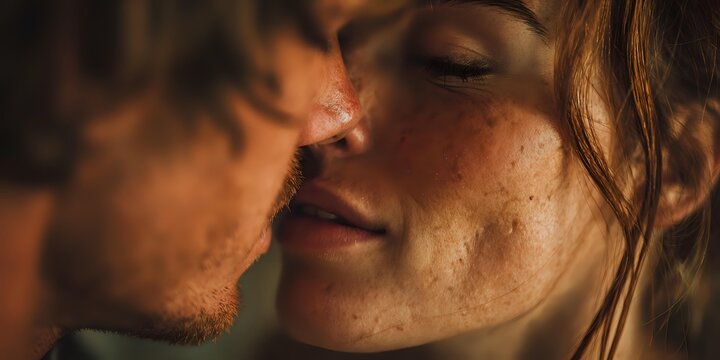 Intimate close-up of young couple sharing tender moment with warm golden lighting, romantic connection between man and woman with freckled skin.