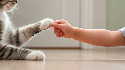 A child's hand gently touches a cat's paw, symbolizing a tender moment of connection between them, set on a light wooden floor.