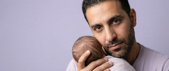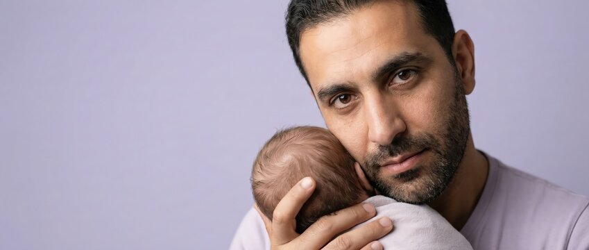 Middle Eastern man holding newborn baby, fatherhood and family love concept, tender moment