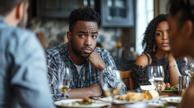 A family having a tense discussion around the dinner table, highlighting family-related stress.