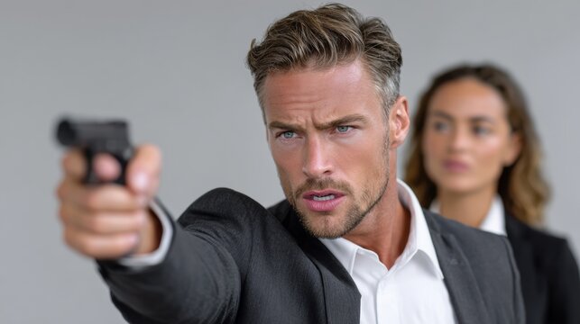 A man is holding a gun and pointing it at a woman. The woman is looking at the man with a surprised expression. Scene is tense and suspenseful