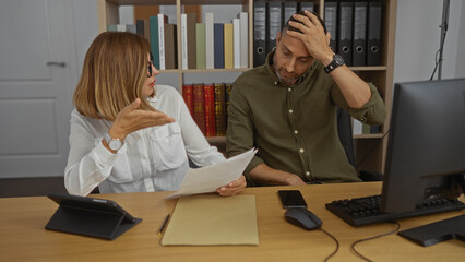Business partners, woman and man, discussing work in an office, both looking stressed, with documents and computer on the desk, indicating a tense work environment.