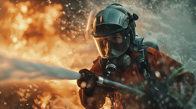 In a tense emergency scene, a fireman bravely battles against roaring flames using water and an extinguisher, clad in a protective firefighter suit to ensure safety amidst the perilous situation