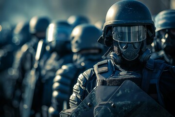 A line of masked police officers in riot gear, prepared for crowd control during a tense situation.