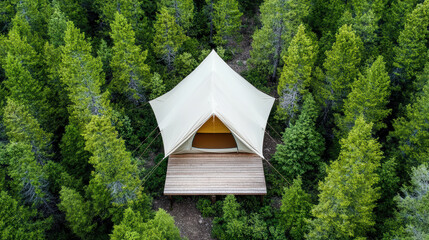 Aerial view of tent surrounded by lush green trees in forest setting, creating serene atmosphere