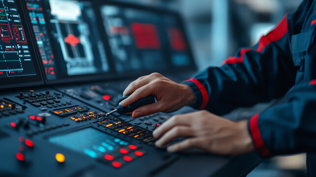 Close-up of a technician's hands operating advanced control panel buttons and switches in a high-tech environment.