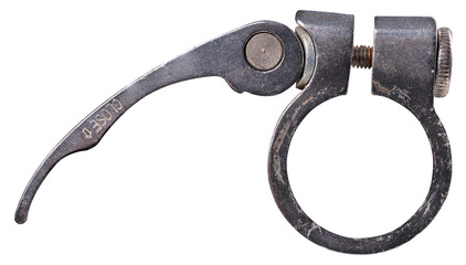 Close up of bike seat post clamp isolated on white background. Cycling equipment.