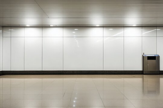 A spacious airport security area boasts a clean and minimalistic design, featuring smooth white walls and polished floors, emphasizing a sterile environment for travelers.