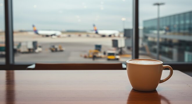 Cup of latte coffee on wooden table with blurry airport tarmac and aircrafts in background. Travel awaiting concept.