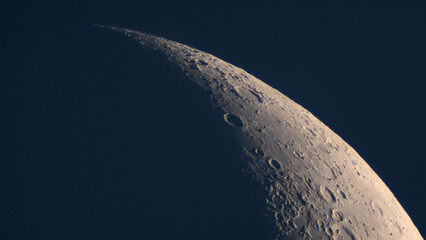 Detailed crescent Moon crater surface at night. Astrophotograph of the Moon s terminator line, showcasing sharply defined craters, rugged mountain ranges and smooth lunar maria under low-angle sunligh