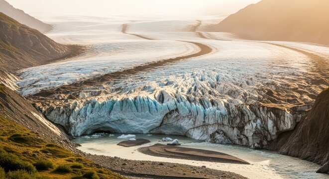 Majestic glacier terminus with ice cave and meltwater river in Alaska