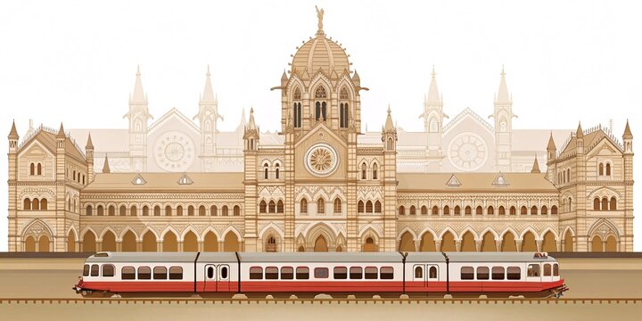 imeless Glory Chhatrapati Shivaji Maharaj Terminus with a Classic Indian Railways Train – Front View on a Pristine White Canvas