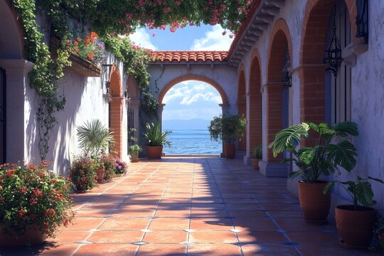Sunlit terracotta archway framing pale plaster courtyard with climbing vines