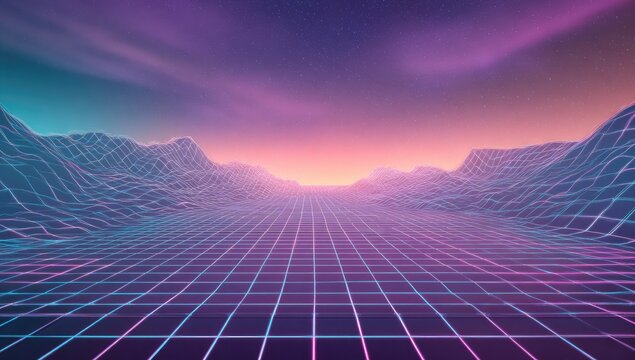Retro-futuristic neon grid landscape with a starry twilight sky