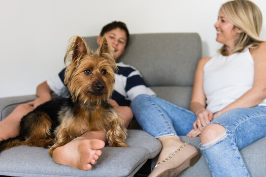 Woman petting terrier dog in a cozy kitchen atmosphere