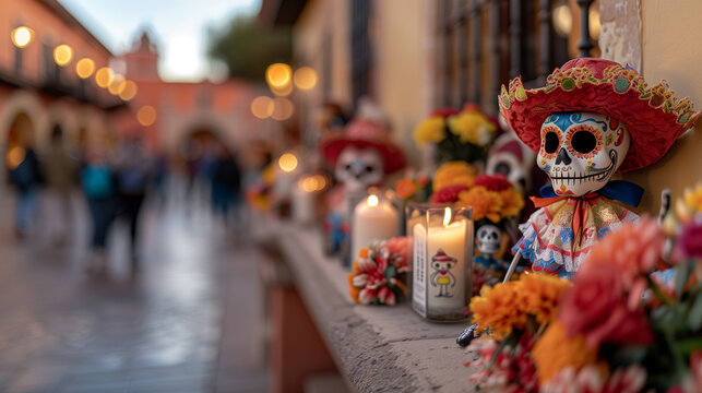 A display of skulls and candles on a ledge
