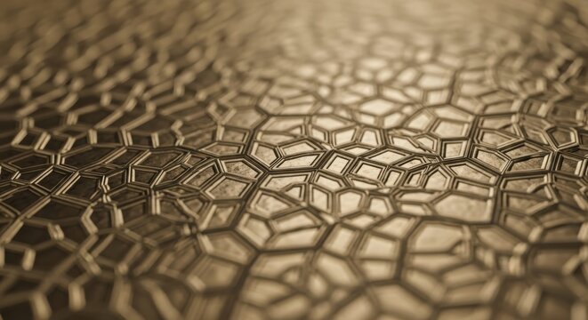 Abstract geometric mosaic pattern with tessellated cells and golden metallic surface creates depth