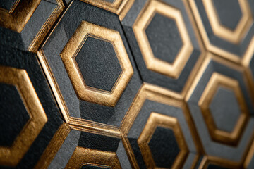 Overlapping hexagonal shapes with gradient fills, arranged in an abstract, tessellated design.