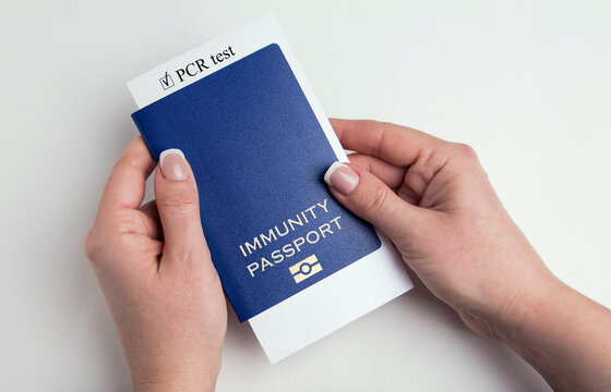 Blue passport in female hands. Human immunity passport on a white background.