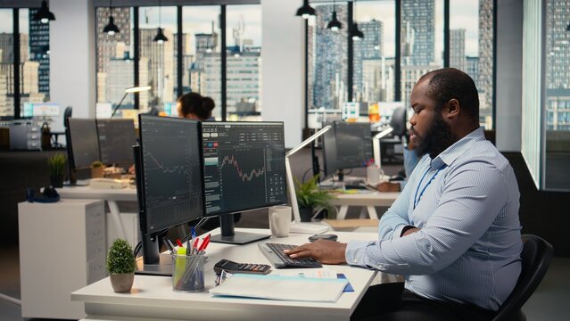 Portfolio manager in prop firm office analyzes stock market trends to enhance investment returns. African american man tracks performance metrics to identify investment opportunities