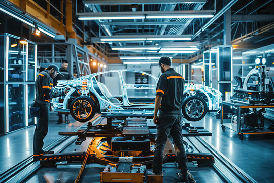 Female automotive technician inspecting hybrid vehicle underbody with futuristic hud