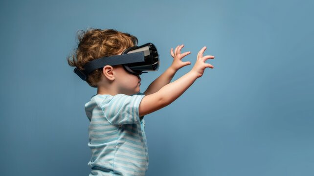 A little boy wears a VR headset and reaches out while testing out augmented technology.