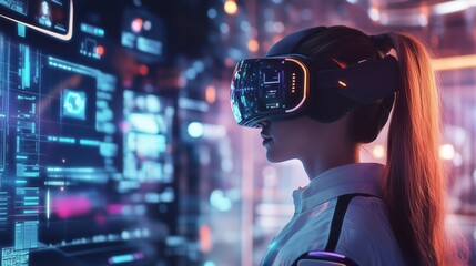 Multi-ethnic office workers testing VR headsets together, using tablet computer and wireless controllers, watching data, working in modern office of hi-tech company. Cyberspace digital technology