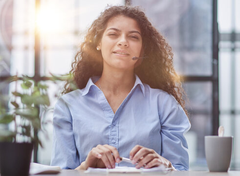 Brunette business woman using headset to communicate and advise people in customer service office.