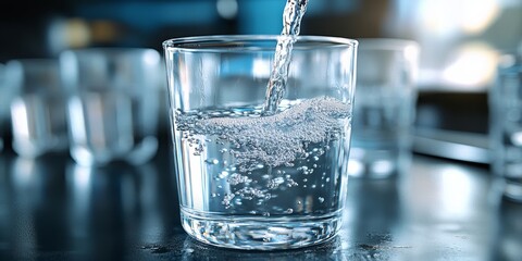 Glasses with clean and dirty water near sink indoors