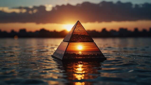 A pyramid in the middle of a body of water at sunset,.