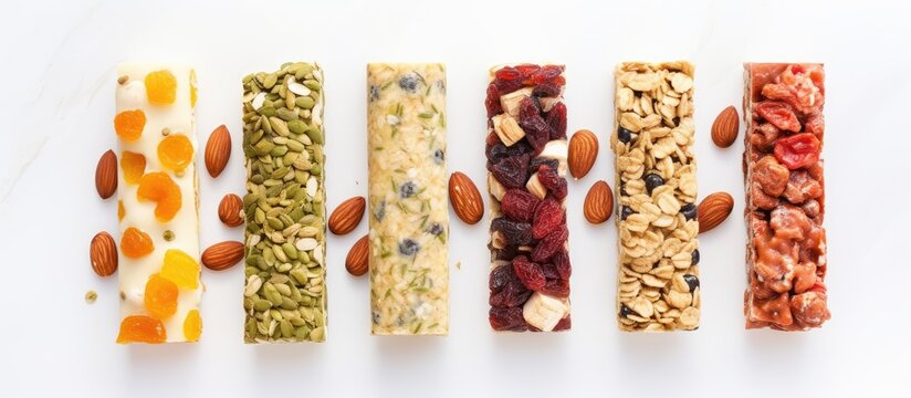 Different energy bars, protein cocktail and powder on wooden table, closeup. Space for text